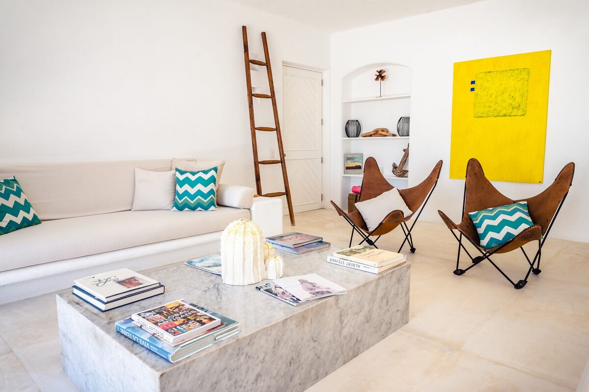Interior touches combine comfort, elegance, and artistry: rooms are minimalist yet warm, with mosaics, artisan lighting, and carefully chosen furniture.